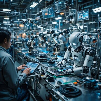 工場の自動化、産業ロボット、人型ロボット、スマートファクトリー。